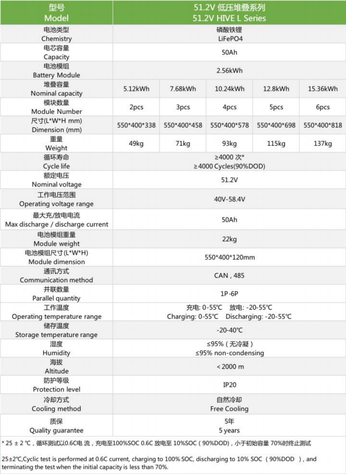 The 51.2V HIVE L series, allowing users to freely choose battery capacity and providing high expandability. The series features A-grade lithium iron phosphate cells with a cycle life of over 4000 times, built-in BMS for safety protection, and supports RS485/CAN communication protocols. The system is also compatible with various energy storage inverters on the market, catering to a diverse range of user needs.